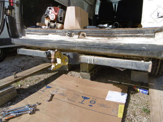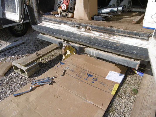 19 Octobre 2020; Démontage de l'attelage de remorque de l'ancien camion de la commune par Pascal, Pierre et Olivier.