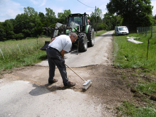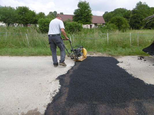 10 Juin 2020: Pose d'enrobé à chaud au hameau du Petit Nilieu par Pascal, Pierre et Olivier.