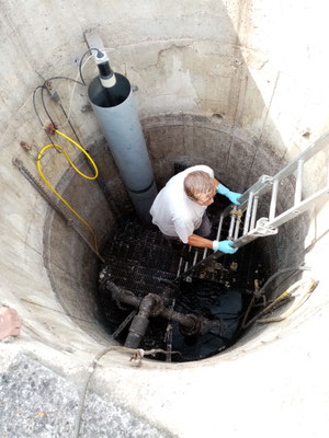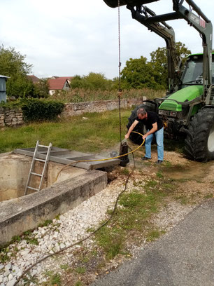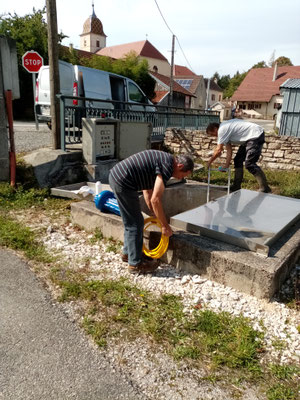 07 Août 2020: Mise en place d'une pompe neuve dans le puits de captage des eaux usées de la rue du Château par Pascal, Pierre et Noël.