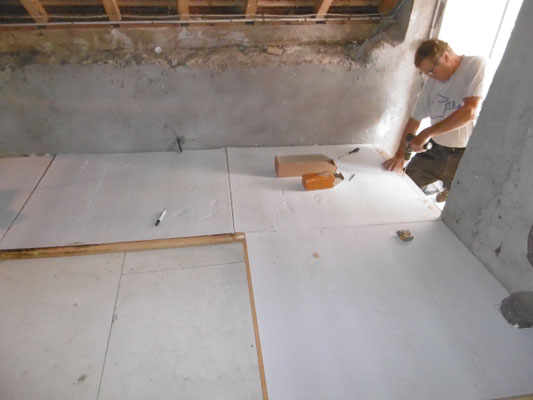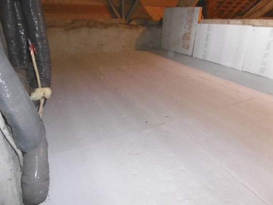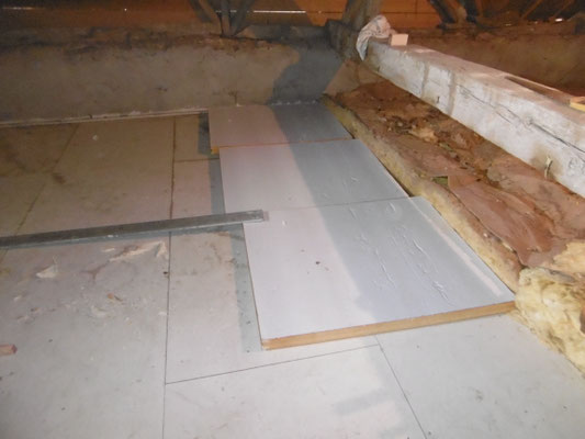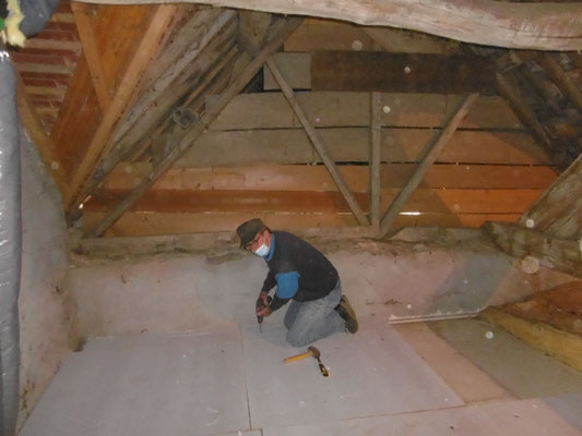 16 Juillet 2020: Pose de plaques isolantes dans le grenier du logement au 30 rue Principale par Pascal et Olivier.