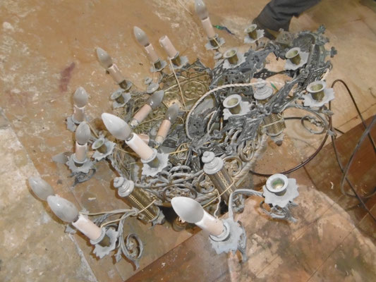 Remplacement du fil de fer qui soutenait le lustre de l'église par un câble en acier, ainsi que le câble électrique par Pascal, Pierre et Olivier.