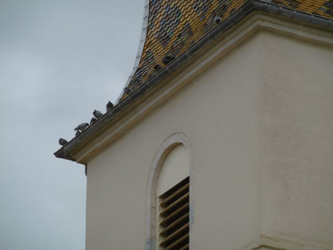28 Mars et 03 Avril 2020: Pose de grillage derrière les abats sons de l'église pour éviter aux pigeons de rentrer dans le clocher par Pierre V. Olivier P. et Pascal A.